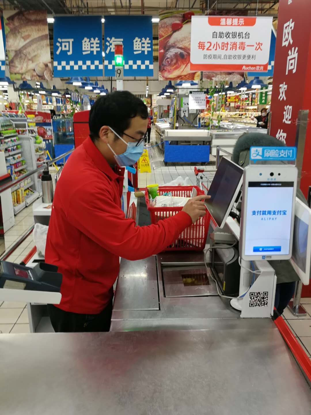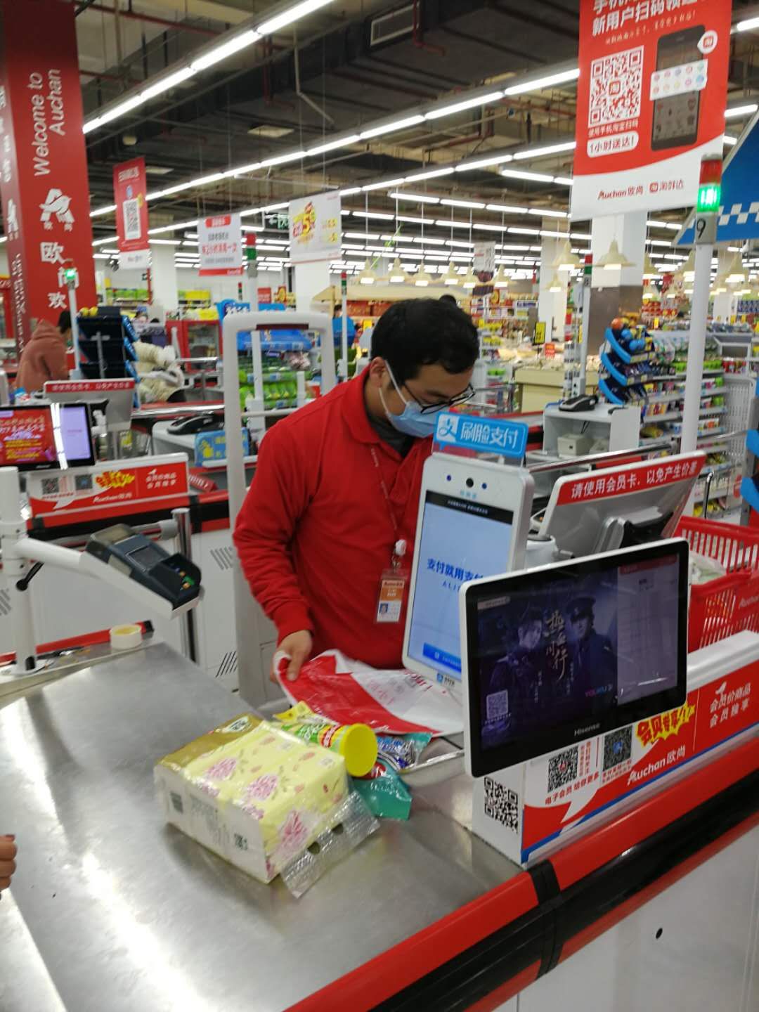 在这个非常时期,地理信息171班崔浩杰同学大胆站出来为百姓的饮食起居提供保障,成为欧尚超市五星店的一名志愿收银员。