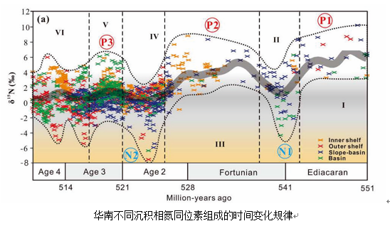 埃迪卡拉纪晚期-寒武纪早期(距今约551-510百万年前)是后生动物快速辐射的关键时期,同时地球大气与海洋的氧气浓度大幅升高(即第二次大氧化事件),二者之间的内在联系一直是学术界热议的话题。论文通过系统分析与整理华南埃迪卡拉系-寒武系海相沉积岩的氮同位素组成,发现南华盆地内海水的氧逸度和氮的赋存形式变化可分为两个阶段:1)盆地内海水的氧逸度均一,含氮离子形式较单一,且在时间上有波动变化(埃迪卡拉纪晚期-寒武纪第二期);2)盆地内海水的氧逸度极不均一,氮元素以多种离子形式存在(寒武纪第三期-第四期)。论文提出这种氧逸度和氮离子形式的变化很可能是寒武纪第二世后生动物快速多样化的关键控制因素。