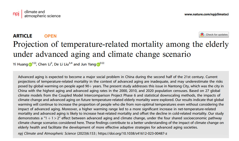 近日,beat365官方网站黄翌副教授与广州医科大学公共卫生学院杨军教授、澳大利亚新南威尔士初级产业部及新南威尔士大学气候变化研究中心刘德立研究员等合作,在气候与大气科学领域的国际著名学术期刊《npj Climate and Atmospheric Science》(《npj气候与大气科学》)发表题为“Projection of temperature-related mortality among the elderly under advanced aging and climate change scenario(人口高龄化和气候变化情景下老年人气温归因死亡预测)”的研究论文。