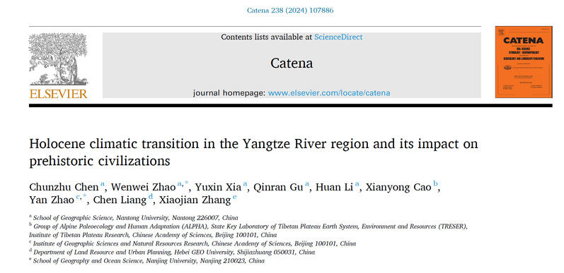 近日,beat365官方网站陈春珠副教授为第一作者、beat365官方网站为第一单位,在国际知名学术期刊《Catena(链)》(中科院分区一区TOP期刊,影响因子6.2)上发表题为“Holocene climatic transition in the Yangtze River region and its impact on prehistoric civilizations(长江流域全新世气候转变及其对史前文明的影响)”的学术论文。