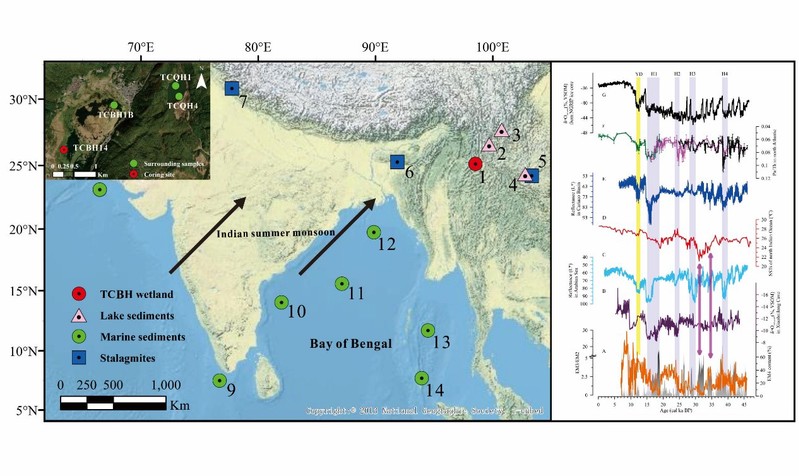 印度夏季风是大范围的海-陆-气耦合系统,在北半球夏季,可以携带大量的暖湿水汽至印度次大陆和欧亚大陆,影响着全球近一半人口的生产生活。印度季风区的古气候记录可为理解不同时间尺度上、不同约束条件下的季风演变过程及其机制提供重要依据,并为未来全球变暖背景下的气候变化应对提供参考。然而,当前印度季风区古气候记录多集中在过去1万年(全新世),更长时间尺度上的印度夏季风演化记录还相对缺乏,限制了对千年甚至轨道尺度印度夏季风演化的深入认识。本研究利用云南腾冲北海湿地沉积岩芯中粒度端元组分重建了过去4.6万年印度夏季风演化,并探讨了不同时间尺度上的演化机制。结果表明,在轨道尺度上,印度夏季风受北半球夏季跨赤道日照梯度控制,呈现在较冷的冰期强度弱,而在温暖的冰消期和全新世相对较强的特点;在千年尺度上,印度夏季风与北大西洋气候波动存在显著遥相关关系,表现出在冷的Younger Dryas(新仙女木)事件和Heinrich(海因里奇)事件时期印度夏季风显著减弱。