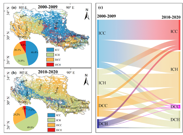 藏北高原的高寒草地生态系统正面临气候变化和人为活动的双重压力,导致草地退化问题日益严重。为应对这一挑战,当地政府实施了一系列管理政策,特别是自2009年起,大规模推广草畜平衡和围栏封育措施。然而,与此同时,藏北高原的干旱问题也在加剧。监测数据显示:与政策实施前(2000-2009年)相比,2010-2020年期间,藏北高原的土壤湿度下降了13.5%,帕尔默干旱指数(PDSI)上升了42.8%,干旱持续时间延长了11.6%。在如此严峻的干旱条件下,通过陆地生态系统模型模拟发现,草地的潜在净初级生产力(NPP)呈下降趋势。然而,卫星时间序列观测却显示出实际草地生产力普遍上升。具体而言,尽管2010-2020年期间干旱严重,实际净初级生产力(基于光能利用效率模型)仍然增长了4.8%,归一化植被指数(NDVI)提高了2.7%,太阳诱导叶绿素荧光(SIF)上升了10%,总初级生产力(GPP)也增加了7.95%。这种生产力的提升主要集中在牲畜数量大幅减少的区域。值得注意的是,草地退化治理措施对净初级生产力增长的贡献比例从2000-2009年的24.8%跃升至2010-2020年的49.8%,几乎翻倍。因此,作者研究表明,大规模的草地退化治理措施在缓解气候变化带来的负面影响方面具有显著潜力。