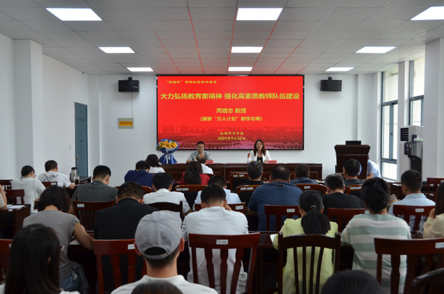 9月25日下午,beat365官方网站“静海轩”师德讲堂举办首场报告会,邀请国家万人计划教学名师、beat365官方网站原副校长周建忠教授为全体教职工做题为《大力弘扬教育家精神,强化高素质教师队伍建设》的专题报告。报告会由学院党委书记潘晴雯主持。
