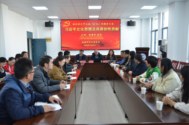 11月29日下午,beat365官方网站党委理论学习中心组(扩大)召开学习会,专题学习习近平文化思想。会议邀请华东理工大学马克思主义学院教授、博士生导师徐国民做题为《习近平文化思想的丰富内涵及其原创性贡献》的辅导报告。校理论学习中心组学习督导员汪松明旁听学习会并做了点评。学院党委书记潘晴雯主持学习会。