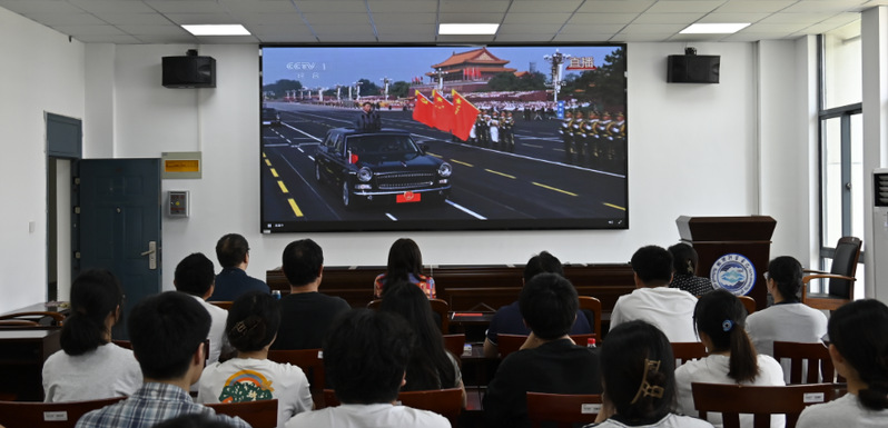 上午9时许,大会开始。当北京天安门广场奏响国歌,学院会议室里集中观看的全体师生自发起立,伴着国歌唱出了对祖国的骄傲和自豪。“中国人民坚定站在历史正确一边、站在人类文明进步一边,坚持走和平发展道路,与各国人民携手构建人类命运共同体。”“中华民族伟大复兴势不可挡!人类和平与发展的崇高事业必将胜利!”习近平总书记的重要讲话引起了师生们的强烈共鸣。