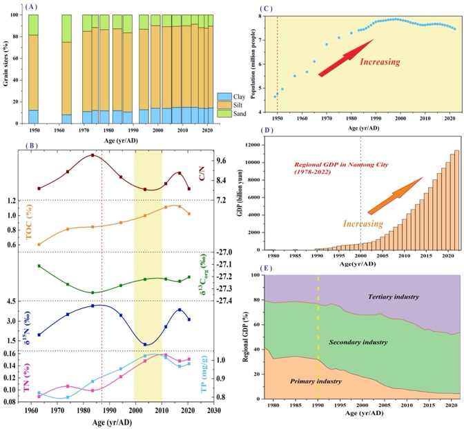 城市湖泊是现代城市水系统和景观设计的重要组成部分,在城市生态文明建设中发挥着重要作用。然而,近年来,城市湖泊生态系统的退化日益严重,尤其是蓝藻水华频繁发生,直接威胁到湖泊生态系统服务功能的维持和城市可持续发展。本研究钻取了长江三角洲地区过去百年来未被清淤过的典型城市湖泊——蝴蝶湖中沉积物岩芯样品。构建其年代序列(自1810s至2020s),分析沉积物中有机质、粒度、营养盐等参数,重建了该湖泊环境长期变化过程及驱动机制。研究结果表明,作为高度发达地区的典型城市湖泊,蝴蝶湖显著受到城市化进程的影响。随着城市的快速发展,湖泊中有机质和营养盐水平逐年上升,特别是磷含量显著增加,成为近年来湖泊水华爆发的关键驱动因子。蝴蝶湖的生态环境还受到周边河道变迁及人类活动的影响。在早期阶段,湖泊受河流动态的影响大于人类活动。但自20世纪60年代起,随着城市建设加剧、经济快速发展以及湖泊周边土地利用类型的变化,进入湖泊中的有机质和营养盐浓度持续增加,使得湖泊原有生态环境受到扰动并退化,进而导致近年来夏季蓝藻爆发现象产生。该研究揭示了人类活动与自然因素共同驱动了城市湖泊环境的变化。