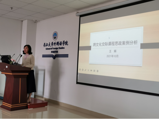 王娟老师结合《跨文化交际》课程思政融入文化设计作了经验分享。她认为,一流课程的建设需要强化立德树人的根本任务,深入推进课程思政建设,并向大家展示了如何通过线上课前思考、线下课堂教学相结合的手段进行教学,巧妙融入课程思政,完善考核评价机制。
