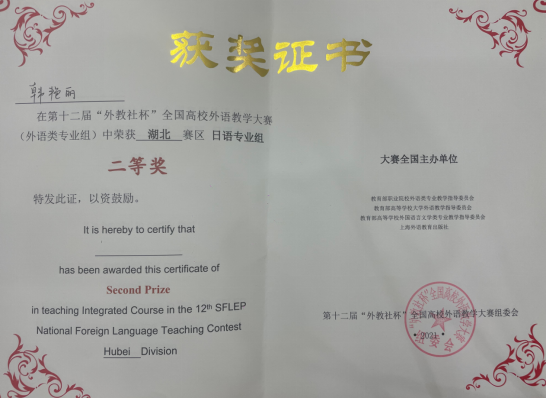 (通讯员:车桥)近期,第十二届“外教社杯”全国高校外语教学大赛(外语类专业组)湖北分赛区决赛结果揭晓。由于目前尚处于疫情防控期间,决赛以线上形式举行,必赢官网日语专业组选手韩艳丽老师在激烈角逐中荣获二等奖。